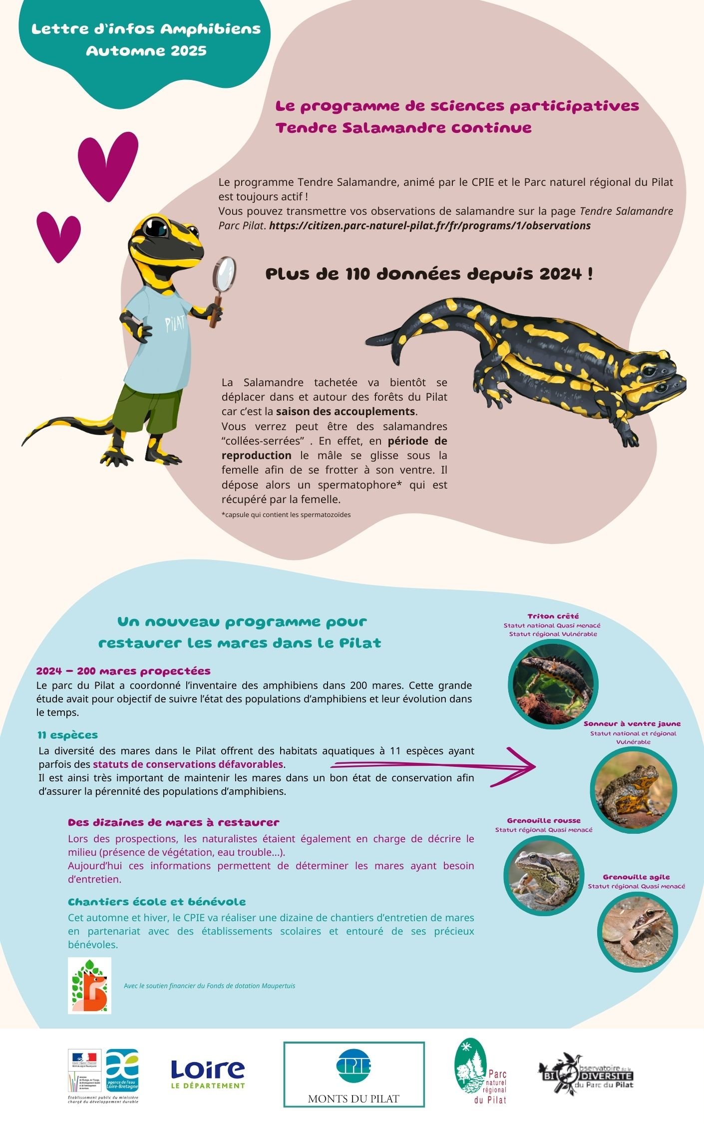 Les actions menées en faveur des amphibiens et des mares reposent sur le soutien du Conseil départemental de la Loire, de l’Agence de l’eau Loire-Bretagne, du Parc naturel régional du Pilat et du Lycée horticole de Montravel à Villars. Ce partenariat permet de mobiliser des compétences complémentaires et d’inscrire les projets dans une dynamique de territoire cohérente et durable.