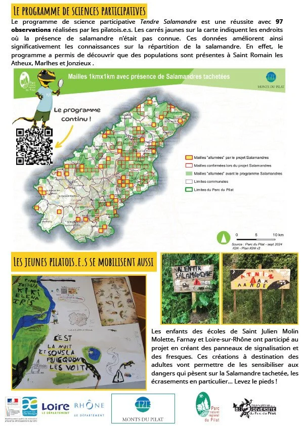 Chaque observation d’amphibiens peut contribuer à enrichir la connaissance locale. Les habitants sont invités à transmettre une photo, ainsi que la date, l’heure et le lieu de leur rencontre avec un individu. Ces informations complètent les inventaires réalisés par le CPIE et aident à mieux comprendre les déplacements, les zones de reproduction et les secteurs menacés. Cette participation concerne aussi bien les espèces communes que les espèces plus discrètes, et elle constitue un appui précieux pour adapter les actions menées sur le territoire. Un projet spécifique consacré à la Salamandre tachetée, lancé en 2023, s’appuie également sur cette participation citoyenne pour documenter la répartition de l’espèce dans le Pilat.