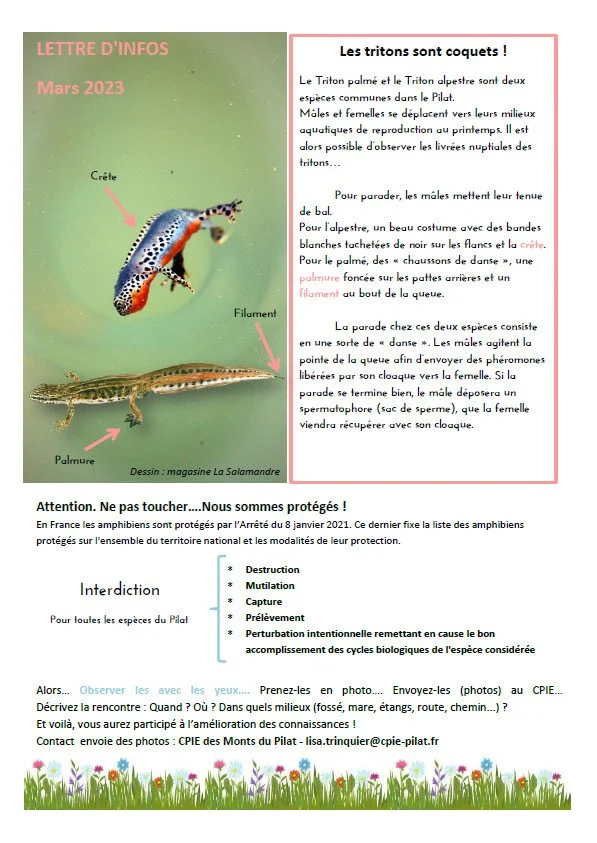 Pour accompagner les personnes intéressées par la préservation des amphibiens et des milieux humides, le CPIE diffuse trois fois par an une lettre d’information dédiée. Cette publication gratuite, envoyée par courrier électronique, présente l’actualité du territoire, les suivis réalisés et les actions menées. Les personnes souhaitant la recevoir peuvent en faire la demande en précisant “lettre d’infos amphibiens” dans leur message.
