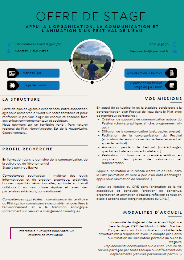 Le stage s’inscrira principalement dans le cadre d’un projet du CPIE et de nombreux partenaires du territoire autour de « L’eau dans le Pilat : un commun » avec comme première action la co-organisation d’un Festival de l’eau dans le Pilat.